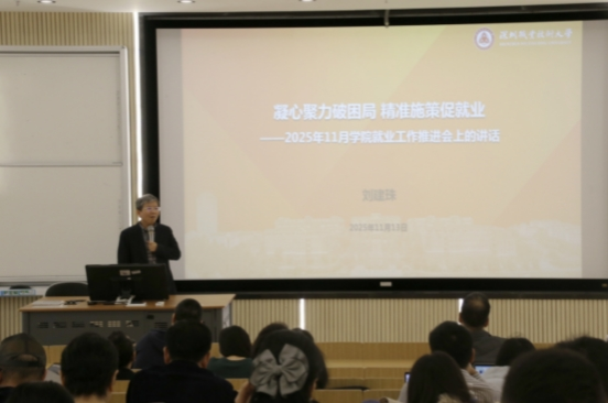 推进会首先由2025届就业工作先进教师代表发言。他们结合自身经验,分享了促进学生就业的有效做法,包括“抢前抓早”、把握关键节点、以及通过“学专协同”深入学生群体进行指导。这些实践经验为2026届毕业生的就业工作提供了有益借鉴。随后,2026届毕业班辅导员详细汇报了近期招聘会工作的进展情况。学院已成功吸引155家优质企业进校招聘,岗位覆盖跨境电商、物流、教培多个领域,与学院专业设置匹配度高。辅导员也分析了招聘会过程中中可能遇到的实际问题。刘建珠副院长在总结发言中,对2025届就业工作取得的成效表示肯定,并强调就业是最大的民生工程。他提出三点要求:一是要推动实习就业一体化,将就业指导贯穿人才培养全过程;二是要持续深化校企合作,拓展优质就业岗位;三是要构建“师生就业情感共同体”,专业教师与辅导员协同发力,为学生提供有温度的就业指导。